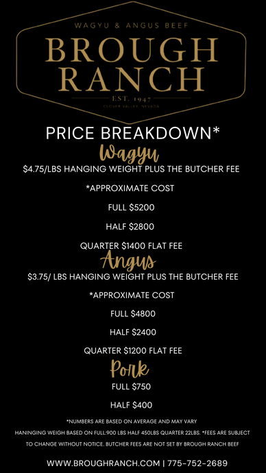 Llame al 775-752-2689 para consultar disponibilidad y realizar sus pedidos de carne completa, mitad o cuarto de res. A continuación se enumeran un desglose de precios y recortes aproximados.